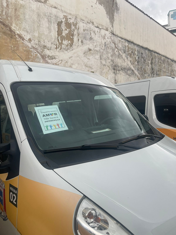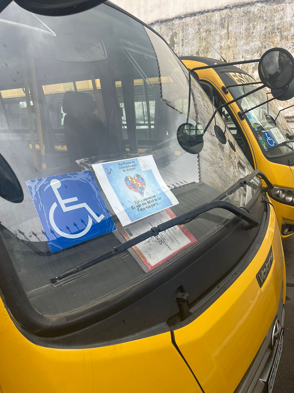 Os ônibus de transporte escolar também estão trazendo mensagens de conscientização, para que todos se lembrem da campanha, reforçando o compromisso coletivo com a inclusão.