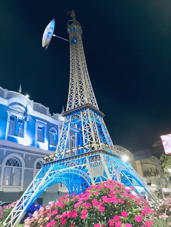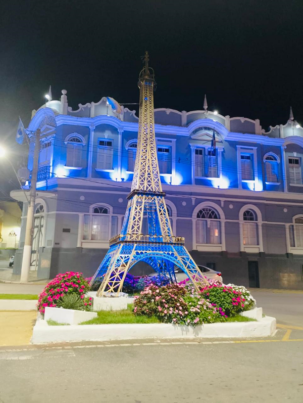 Prédio da Prefeitura e réplica da Torre Eiffel estão iluminados de azul